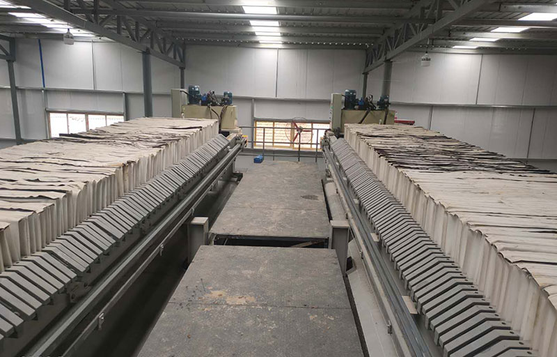 高干度,高產能,廢渣可壓榨至含水率30%以下,低至15%,比普通廂式壓濾機低10個點,比帶式壓濾機低15個點,配置我司兩臺XMYD1500-130PC-400廂式高壓壓濾機可滿足1000m3/d洗砂生產線的廢渣脫水需求。