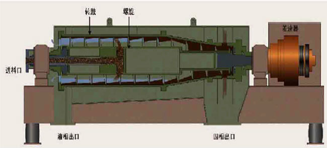(4)雙向擠壓段:在轉(zhuǎn)鼓的圓錐段,螺旋輸送器經(jīng)過適當(dāng)?shù)脑O(shè)計(jì),沿軸方向產(chǎn)生雙向擠壓力。配合離心機(jī)的壓縮作用,進(jìn)一步將污泥的毛細(xì)水?dāng)D出,污泥從卸料口排出。