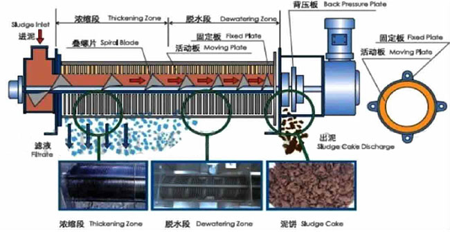 (4)脫水:疊螺主體內(nèi)的螺旋軸的螺距逐漸變小,環(huán)與環(huán)之間的空隙也逐漸變小,在排出口的背壓板的作用下,脫水部?jī)?nèi)產(chǎn)生極大的內(nèi)壓,使礬花在脫水部充分脫水。