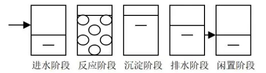 根據時間進行劃分的間歇式活性污泥法可統稱為SBR法。典型SBR工藝過程的一個完整運行包括五個階段,依次為:進水階段-加入基質;反應階段-基質降解;沉淀階段-泥水分離;排水階段-排出上清液;閑置階段-等待下一次進水。SBR法污水處理工藝流程如圖2所示。