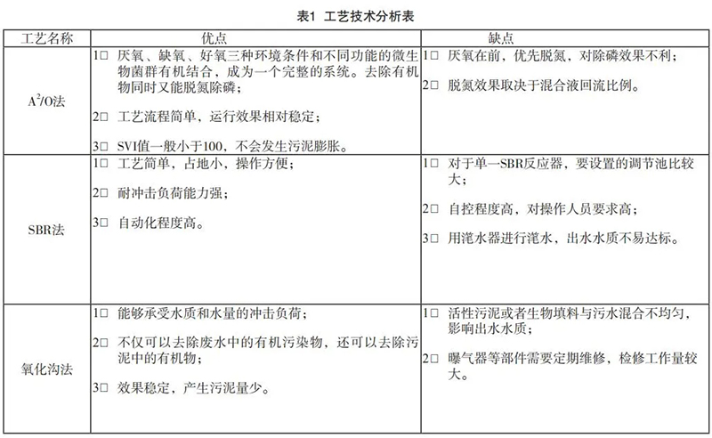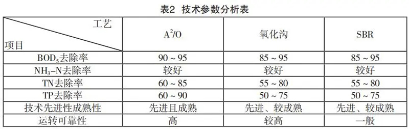 A2/O工藝、SBR工藝和氧化溝工藝的工藝技術分析和技術參數分析見表1和表2。